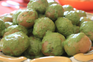 En una olla grande con agua cocemos las papitas a un punto medio con todo y piel,en la licuadora vamos a poner,la albahaca,vino blanco,crema liquida,los jalapeños,la cebolla y el ajo,lo licuamos a que tenga un punto cremoso no completamente liquido.